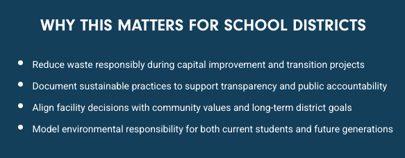 By inventorying assets early and aligning disposition strategies with construction schedules, districts can reduce disposal costs, extend the life of existing furniture, and make informed decisions that balance environmental, social, and fiscal responsibility.